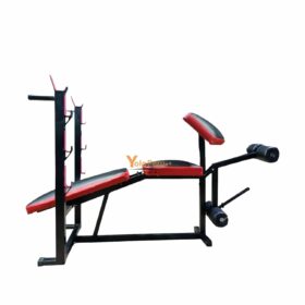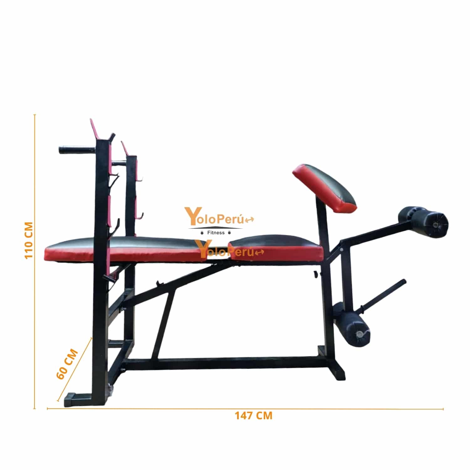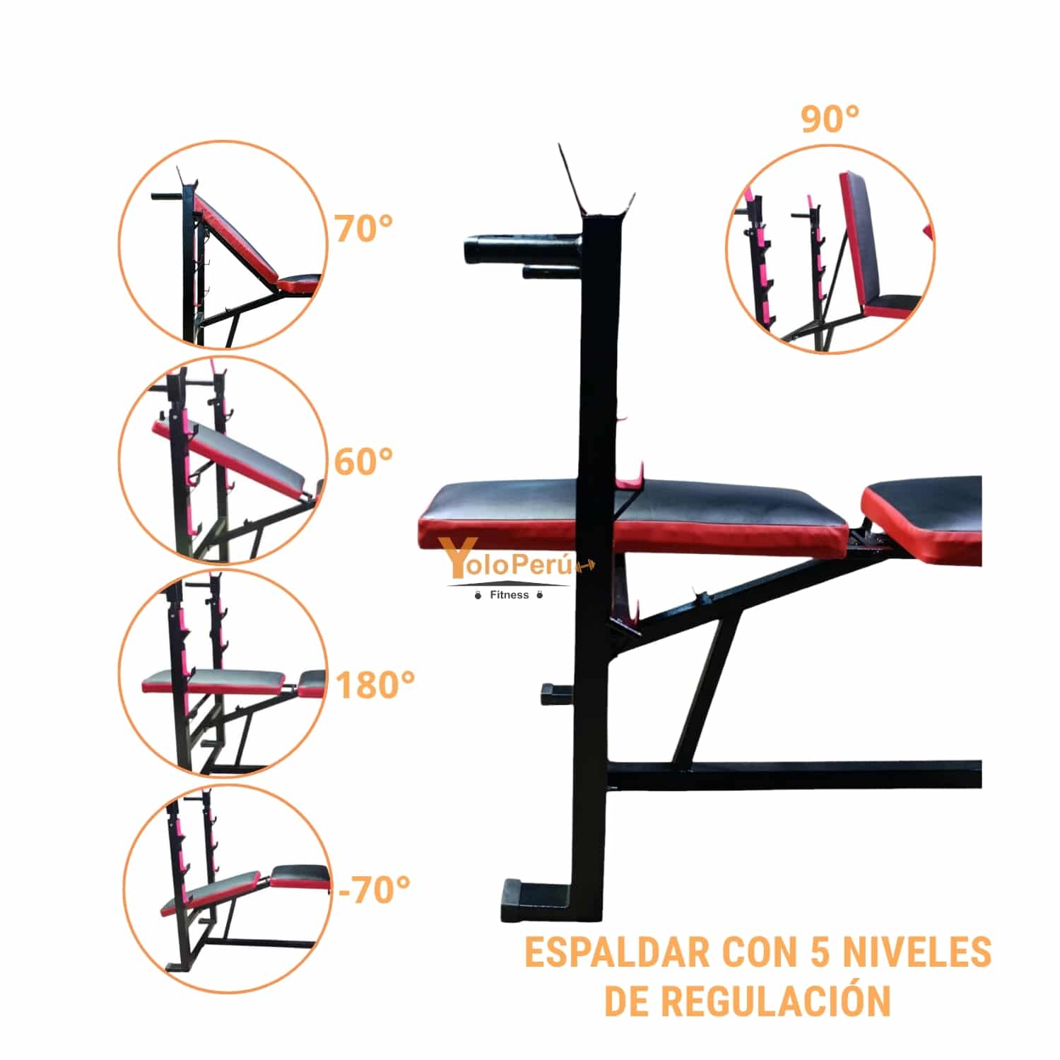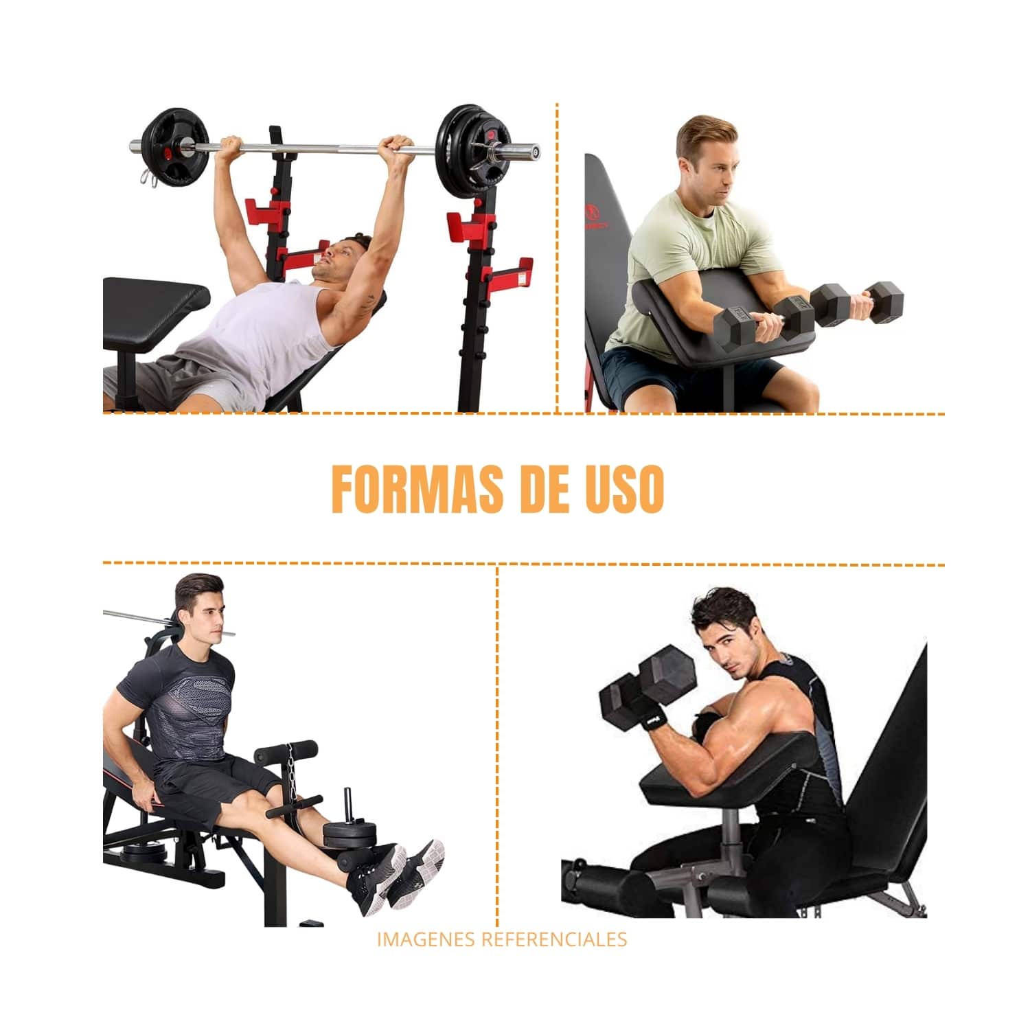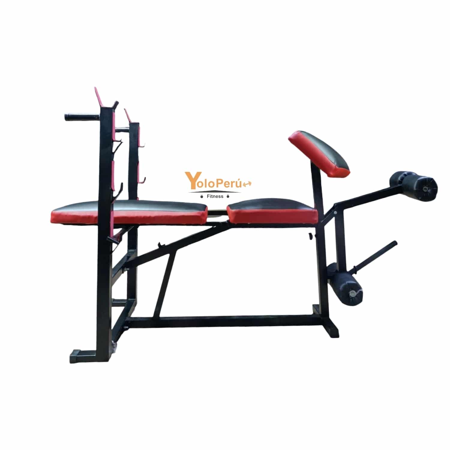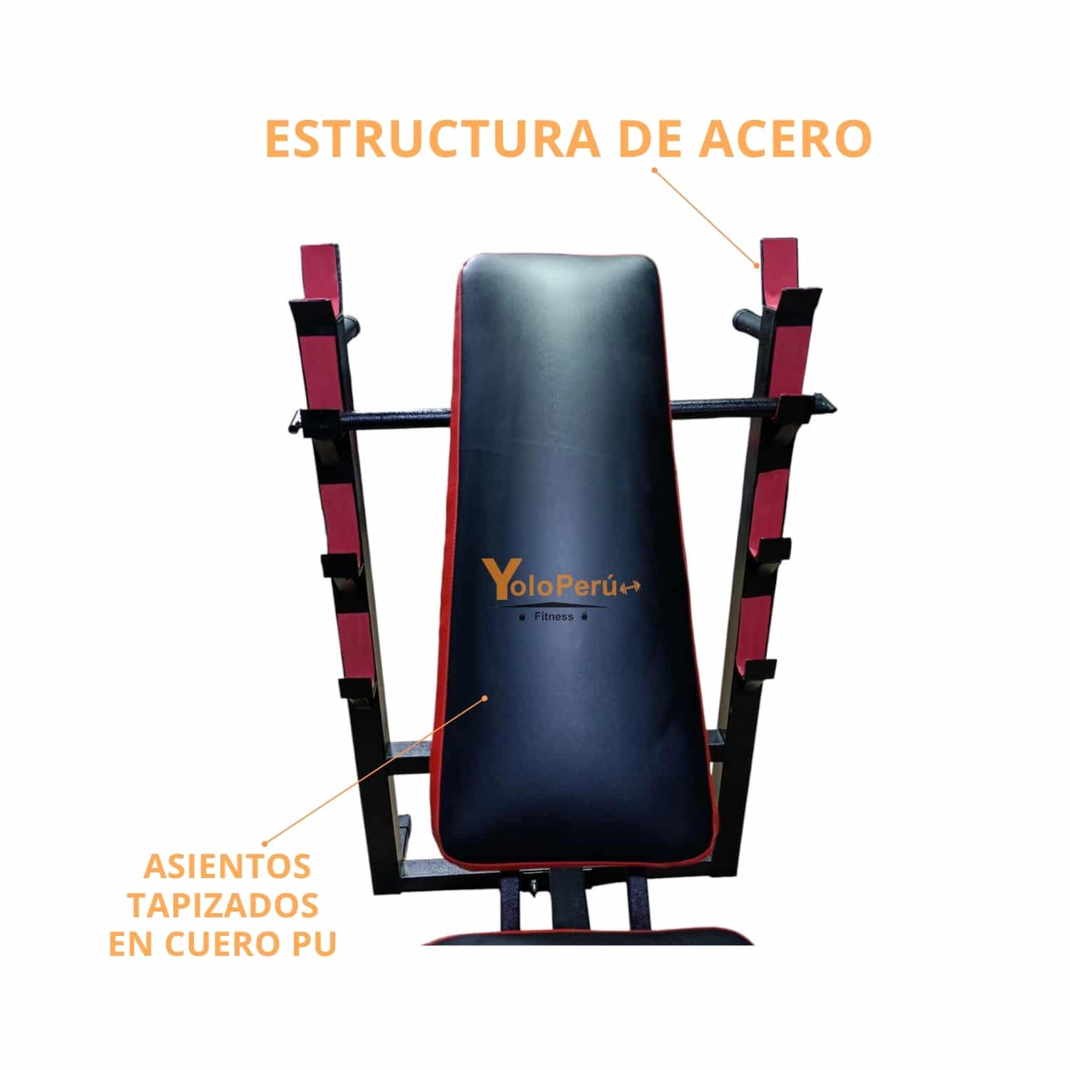 - Cuenta con rack fijo que Permite colocar la barra recta , ideal para press de pecho, press inclinado y otros ejercicios de fuerza.