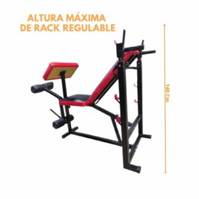 Banca multiusos para entrenamiento de fuerza cuenta con un rack regulable que permite ajustar la altura para colocar la barra recta con comodidad y seguridad, adaptándose a tus necesidades de entrenamiento. Ya sea que quieras trabajar pecho, brazos, abdomen o piernas, este equipo lo tiene todo para ayudarte a alcanzar tus objetivos sin salir de casa.