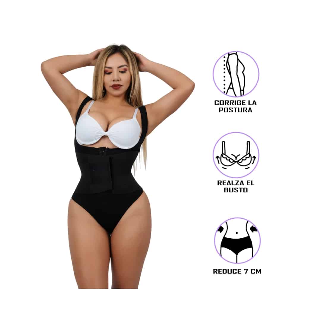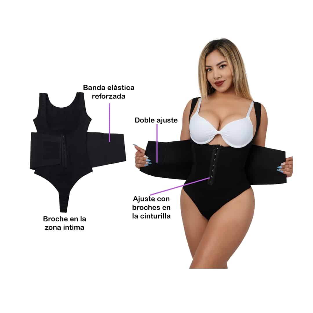 - Doble compresión en la zona media para reducir medidas y moldear la figura