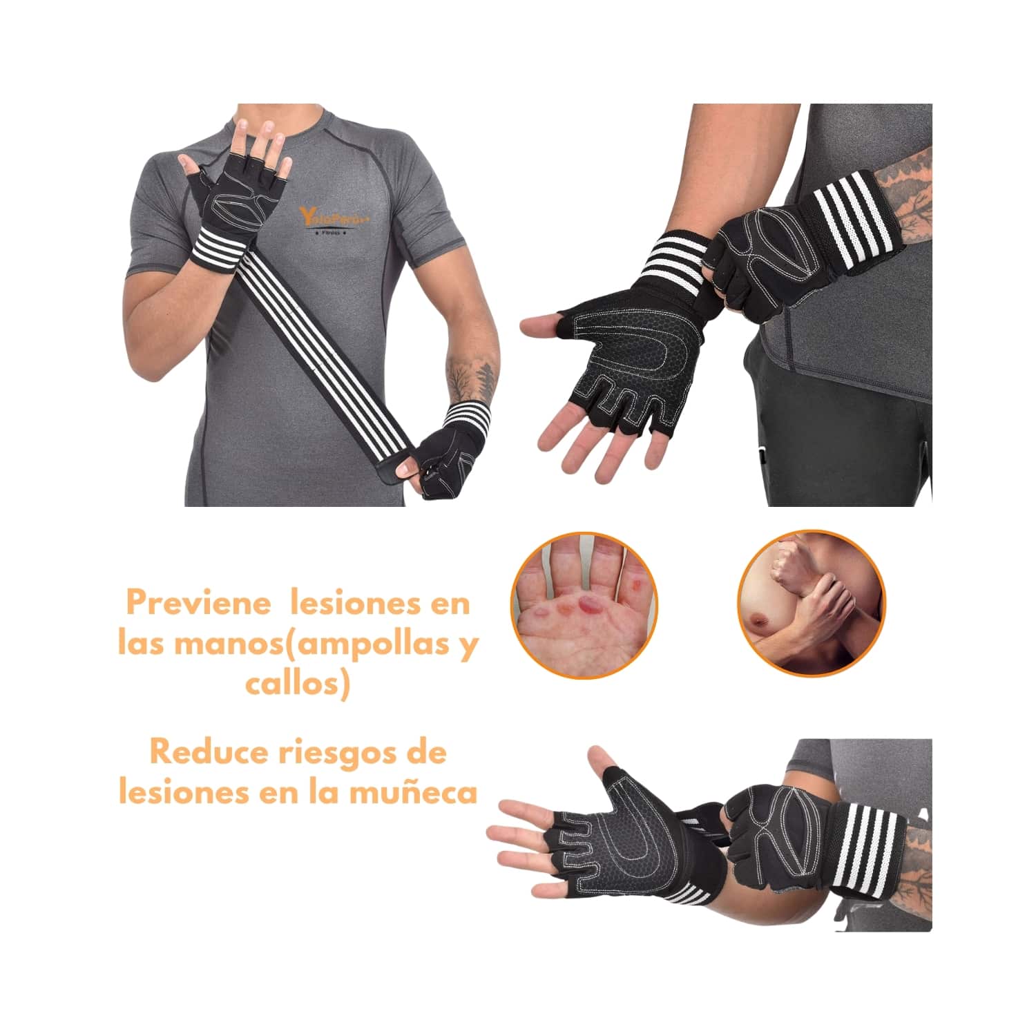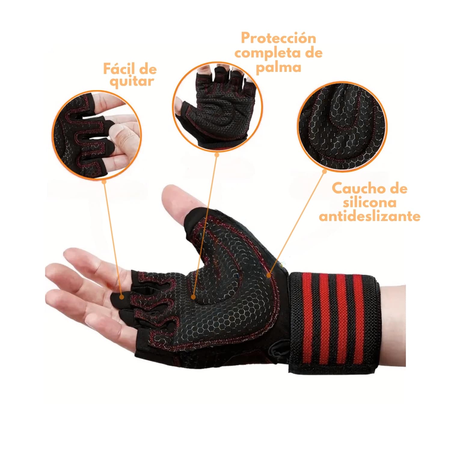 - Material: Tejido transpirable tipo malla, palma con acolchado de espuma EVA o silicona antideslizante, costuras reforzadas, correa de velcro (gancho y bucle).