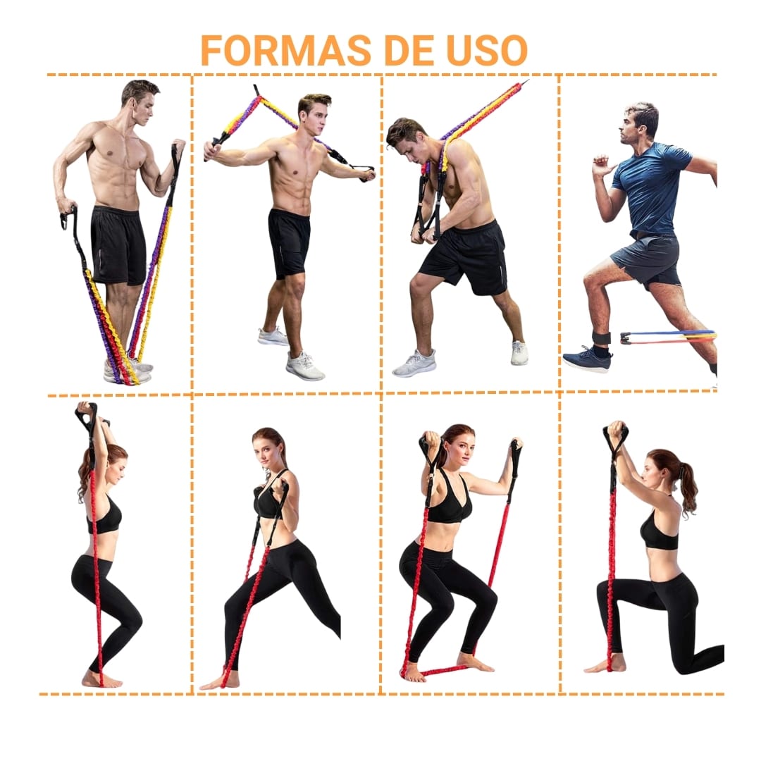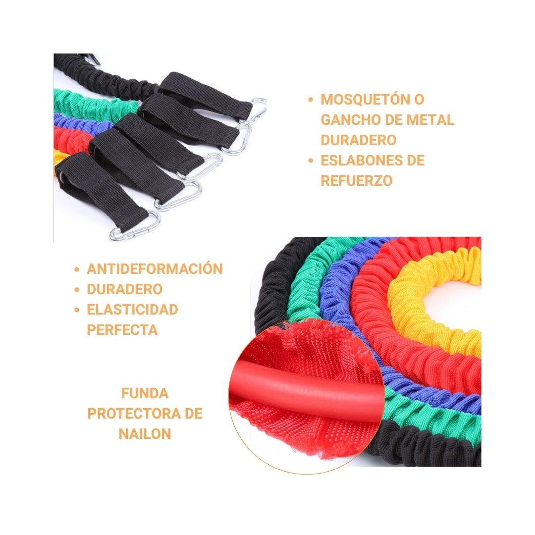 Incluye 5 bandas de resistencia de distintos colores, cada una con un recubrimiento protector de nailon, que las hace más seguras, resistentes al desgaste y duraderas: