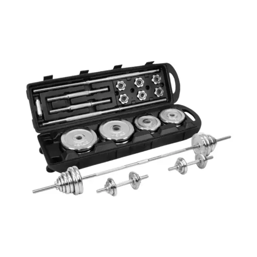 - Material: Discos de hierro cromado y barras con mango texturizado antideslizante para un agarre cómodo y seguro.