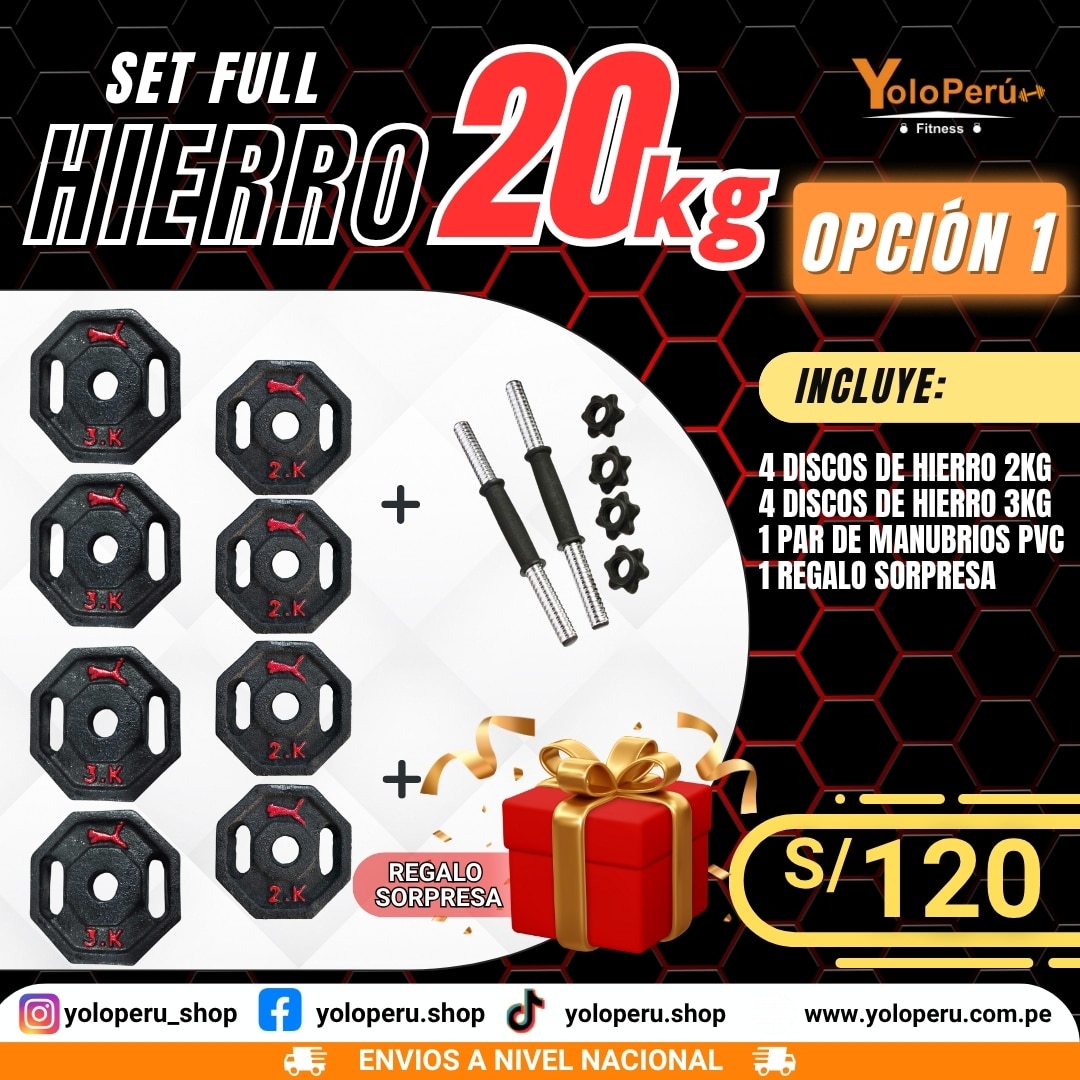 Llévate tu Set Full Hierro de 20 kg 💪 y entrena con la máxima fuerza y resistencia 🔥. Este set compacto y poderoso está diseñado para quienes buscan calidad y durabilidad en cada rutina 🏋️♂️. Ideal para entrenamientos intensos que exigen rendimiento y resultados reales 🏆