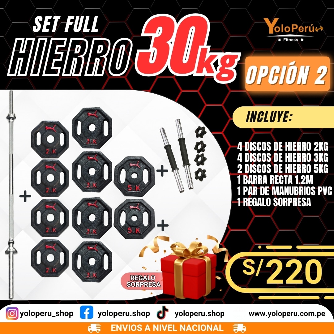 Llévate tu Set Full Hierro de 30 kg y disfruta de potencia y resistencia al máximo nivel 💪🔥. Este set completo y robusto está diseñado para quienes buscan entrenamientos intensos y duraderos, para que eleves tu rendimiento y logres resultados reales con calidad que dura.