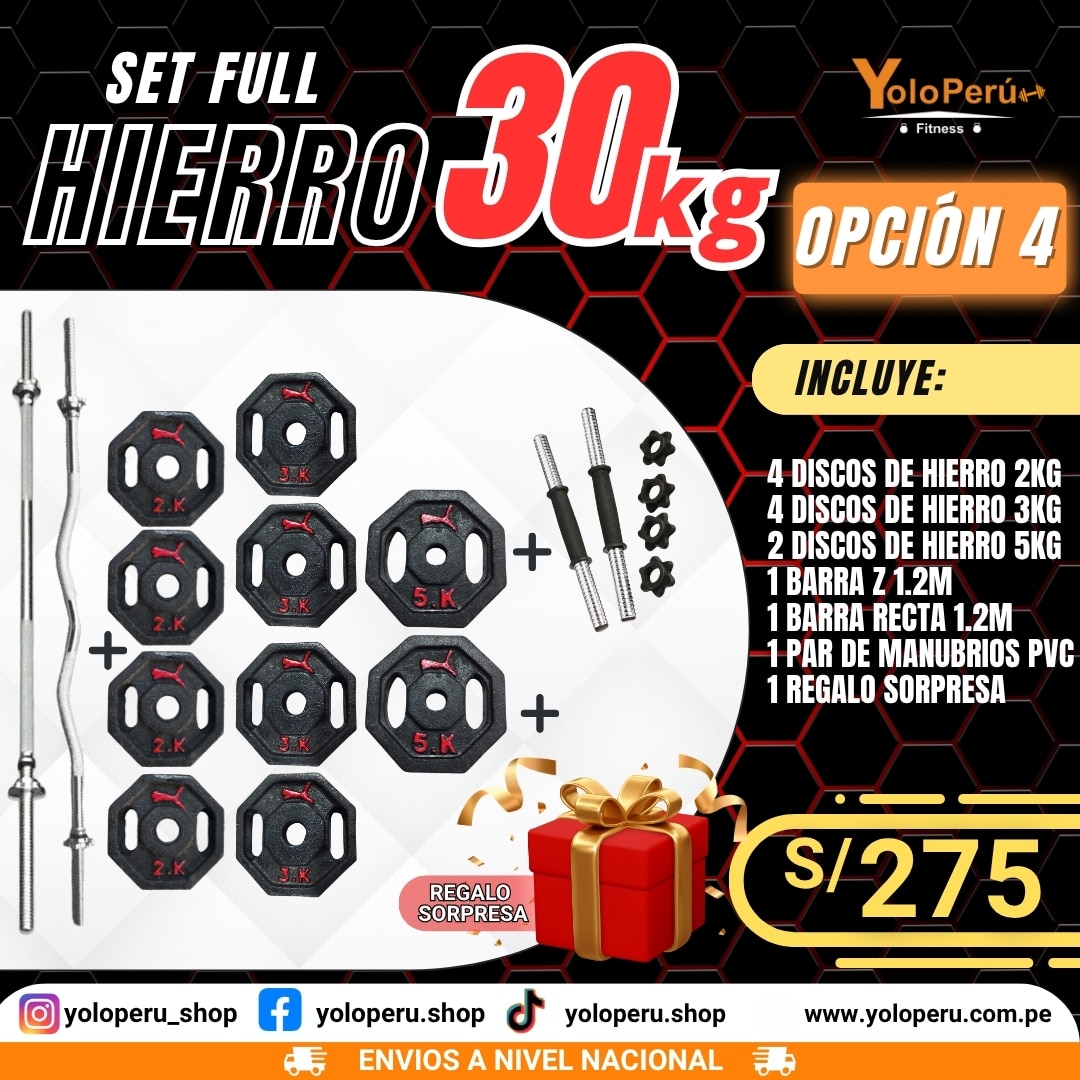 Llévate tu Set Full Hierro de 30 kg y disfruta de potencia y resistencia al máximo nivel 💪🔥. Este set completo y robusto está diseñado para quienes buscan entrenamientos intensos y duraderos, para que eleves tu rendimiento y logres resultados reales con calidad que dura.
