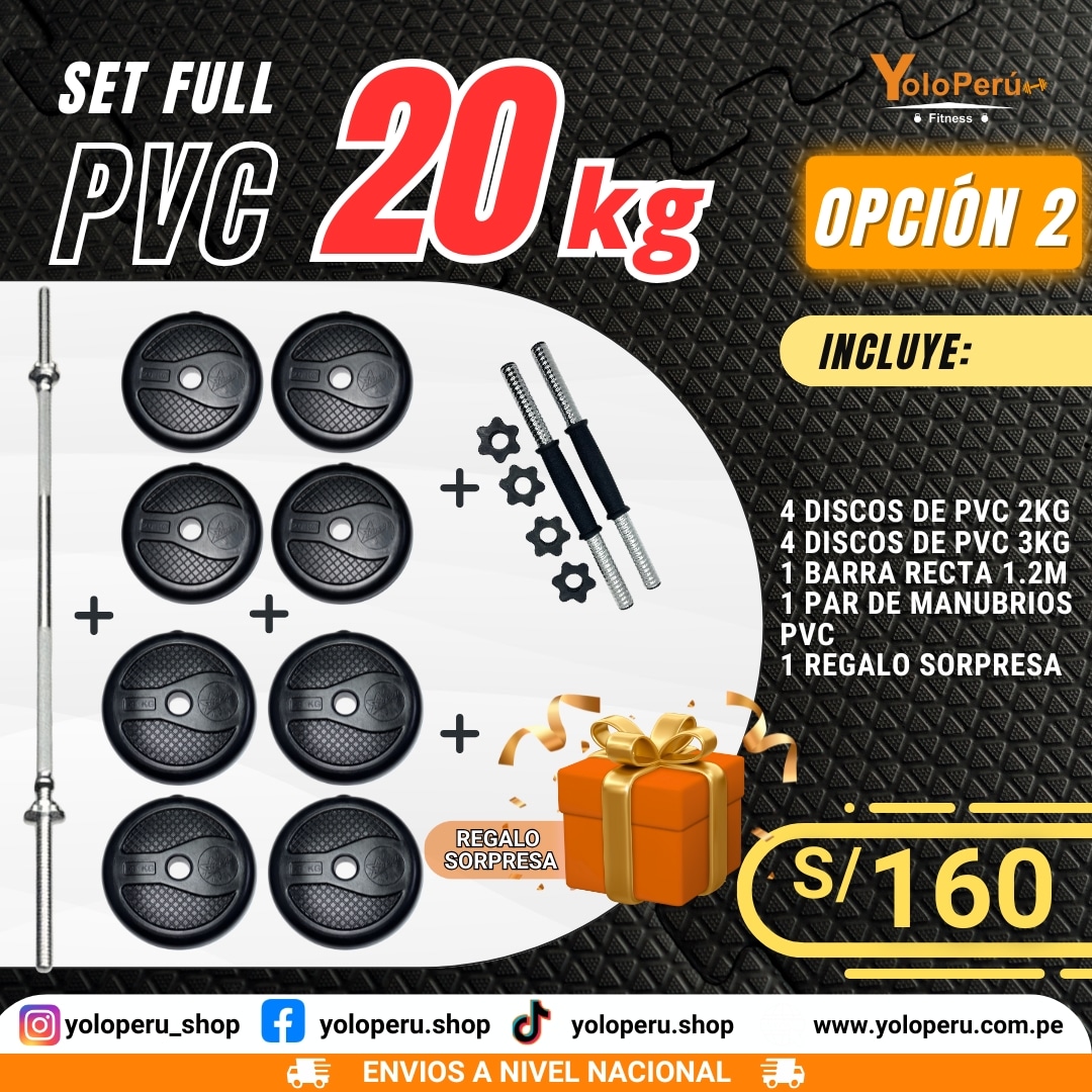 Llévate tu Set Full PVC de 20 Kg, ligero, resistente y perfecto para entrenamientos efectivos y cómodos. Dale a tu rutina un impulso con calidad y estilo.