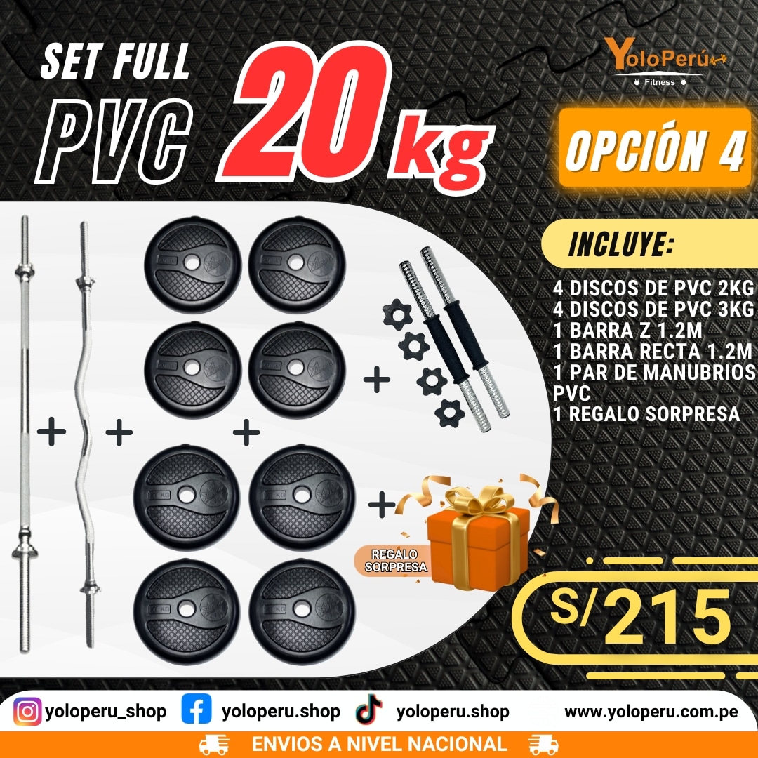 Llévate tu Set Full PVC de 20 Kg, ligero, resistente y perfecto para entrenamientos efectivos y cómodos . Dale a tu rutina un impulso con calidad y estilo.