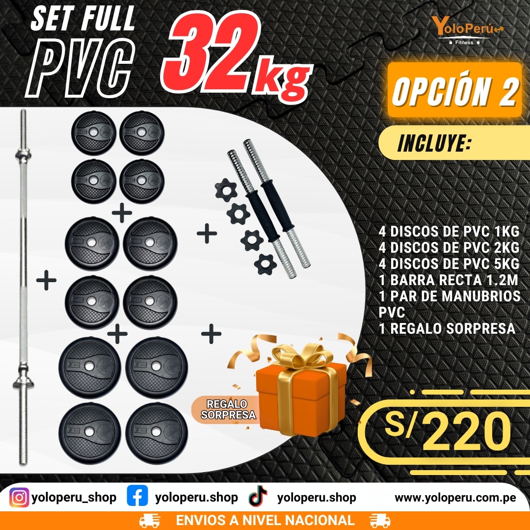 Llévate tu Set Full PVC de 32 Kg, ideal para entrenamientos efectivos y cómodos con la resistencia justa para subir tu nivel 🏋️♂️🔥. Calidad, estilo y funcionalidad en un solo set.