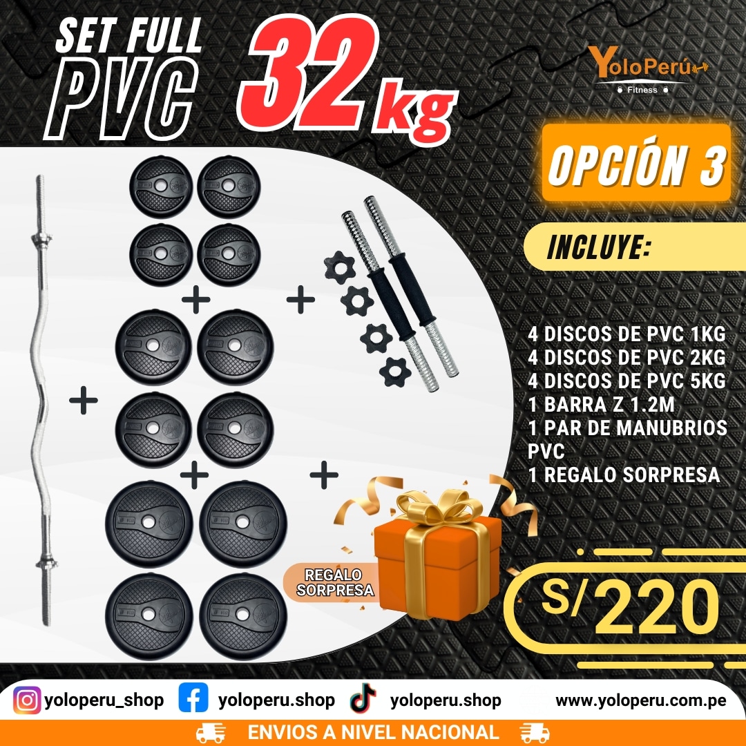 Llévate tu Set Full PVC de 32 Kg, ideal para entrenamientos efectivos y cómodos con la resistencia justa para subir tu nivel 🏋️♂️🔥. Calidad, estilo y funcionalidad en un solo set.