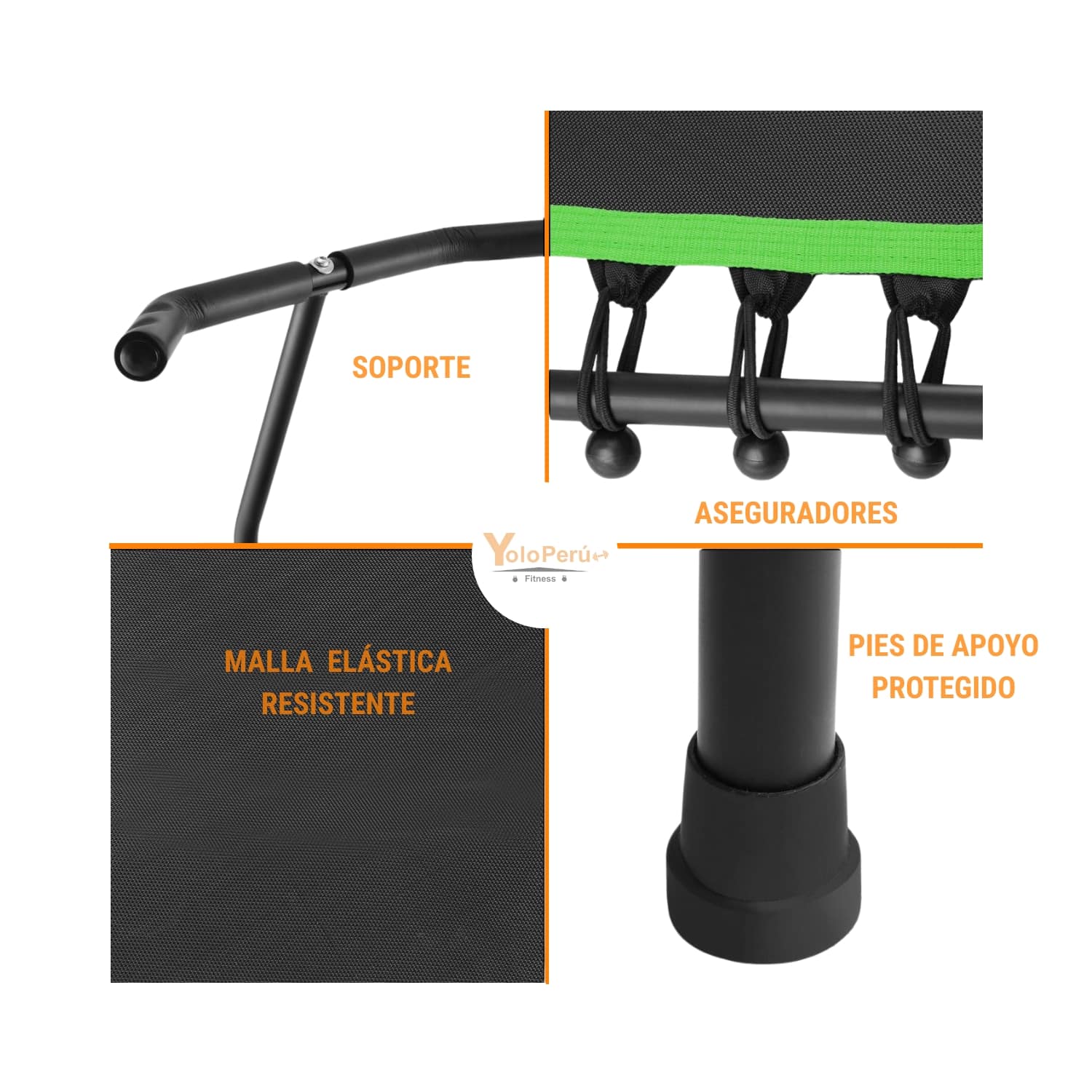 - Material: Acero reforzado de alta resistencia con malla de salto antideslizante y anti desgaste sujetada con cuerdas elásticas silenciosas y duraderas.