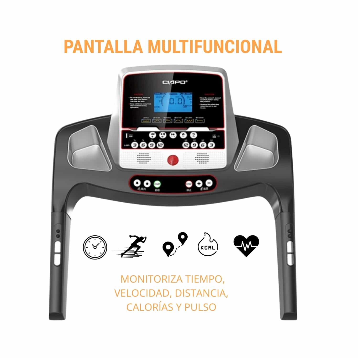 - Funciones de la pantalla: Tiempo, velocidad, distancia, calorías, inclinación, pulso, IMC y medición de grasa corporal.